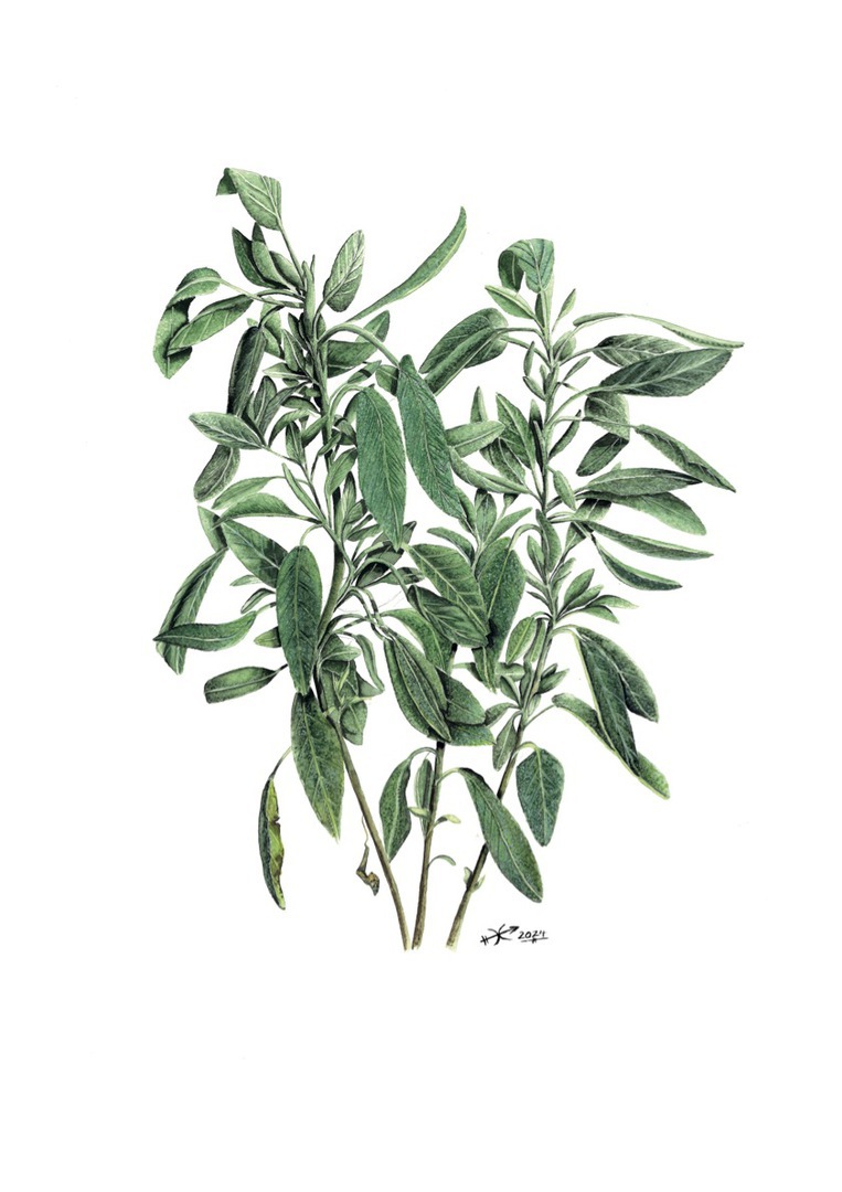 Diesen Salbei zeichnete ich im Sommer des Jahres 2024. Er tauchte zwei Jahre zuvor direkt an der Kalksteinmauer meines Treppenaufganges zum Haus in Buchfart auf. Im ersten Jahr zeigte sich ein kleines und zierliches Pflänzchen. Im zweiten Jahr war er zu einer Größe herangewachsen, die ungefähr etwa dem zehnfachen des ursprünglichen Pflänzchens entsprach. Im dritten Jahr katapultierte er sich zu einem beeindruckenden Strauch, den ich abfangen musste, weil er sich weit über den Weg beugte, der am Haus vorbeiführte.